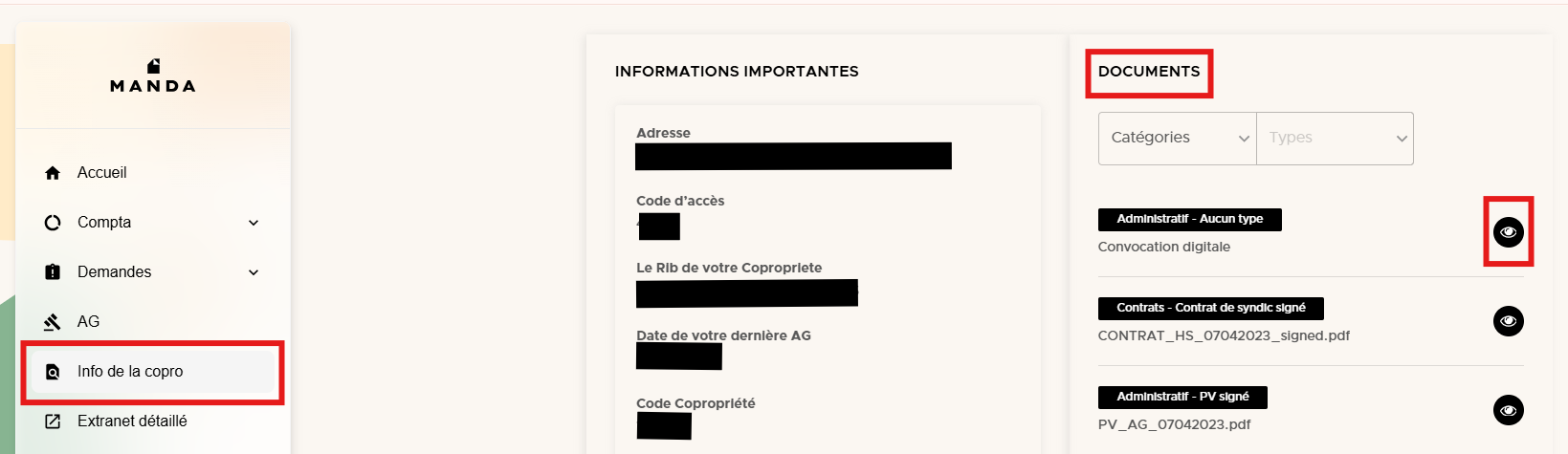 Il suffit ensuite de cliquer sur l'onglet "Info de la copro", les documents sont ensuite affichés sur la gauche de l'écran (sous le titre "Documents").